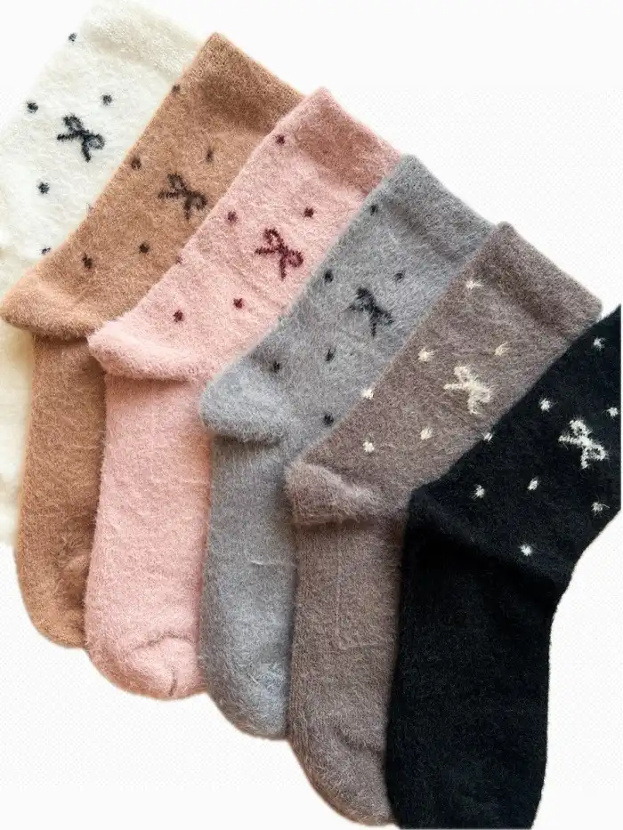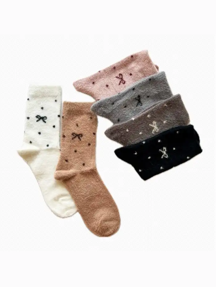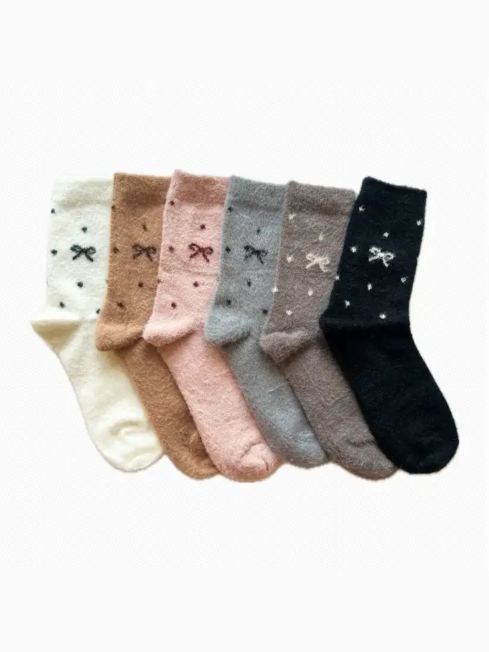این جوراب با بافتی نرم و پف‌دار از الیاف موهر تولید شده تا در روزهای سرد پاییز و زمستان، پاهایتان را گرم و راحت نگه دارد. طراحی پاپیون‌های ظریف و طرح نقطه‌ای روی پارچه، به آن جلوه‌ای دخترانه و دل‌نشین می‌دهد.